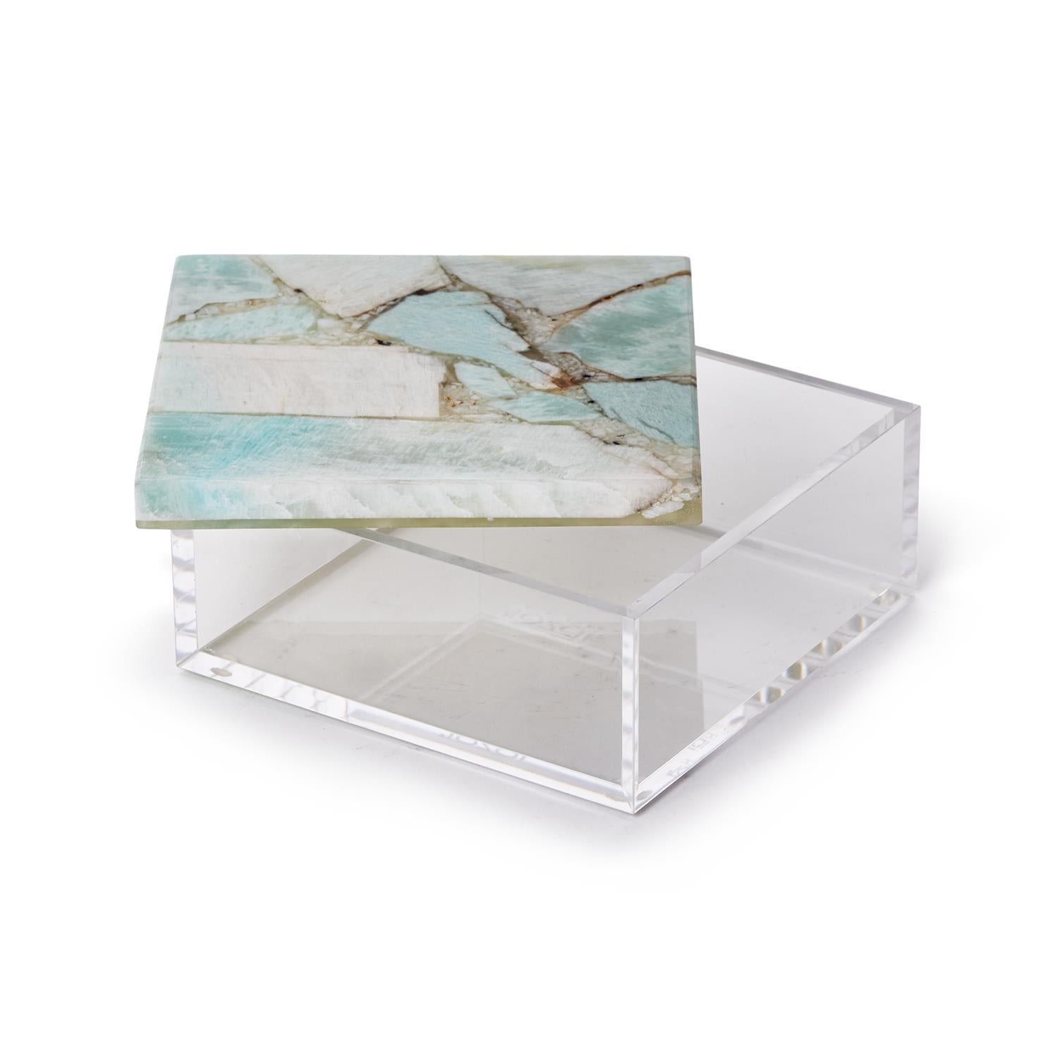 Elevate your home design with the exquisite sophistication of this genuine Amazonite covered box. This lustrous material exudes an innate beauty that transcends ordinary home accessories. Each acrylic base is covered with an Amazonite stone top offering a textured and enchanting addition to any space. Embrace the uniqueness of Amazonite, as each piece showcases its distinct variances in color and pattern, ensuring that no two are exactly alike.