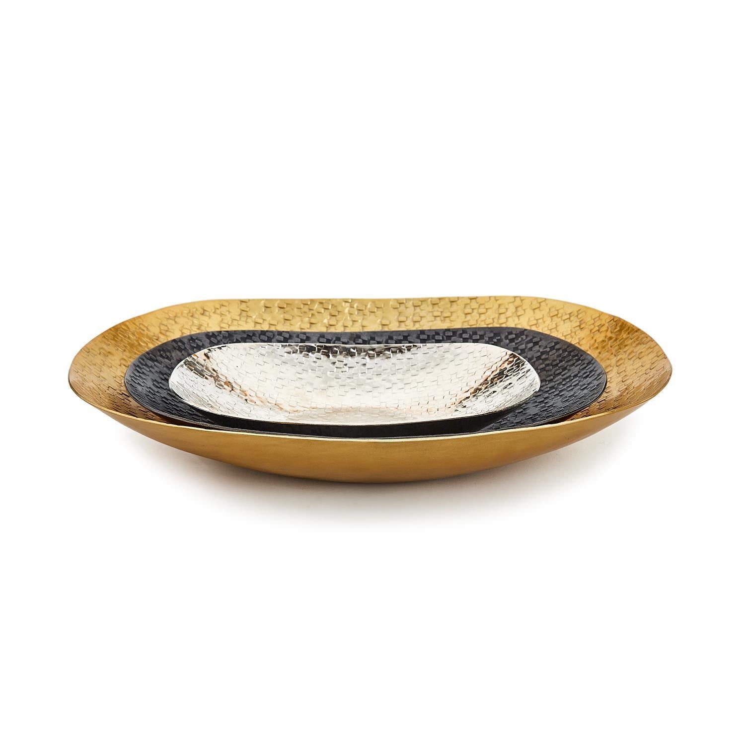 These uniquely shaped trays make a elegant and rich statement with their 3 dimensional basket weave design. Crafted in recycled aluminum, each has a elegant rich patina that shows off just perfectly the hammered texture on the surface.