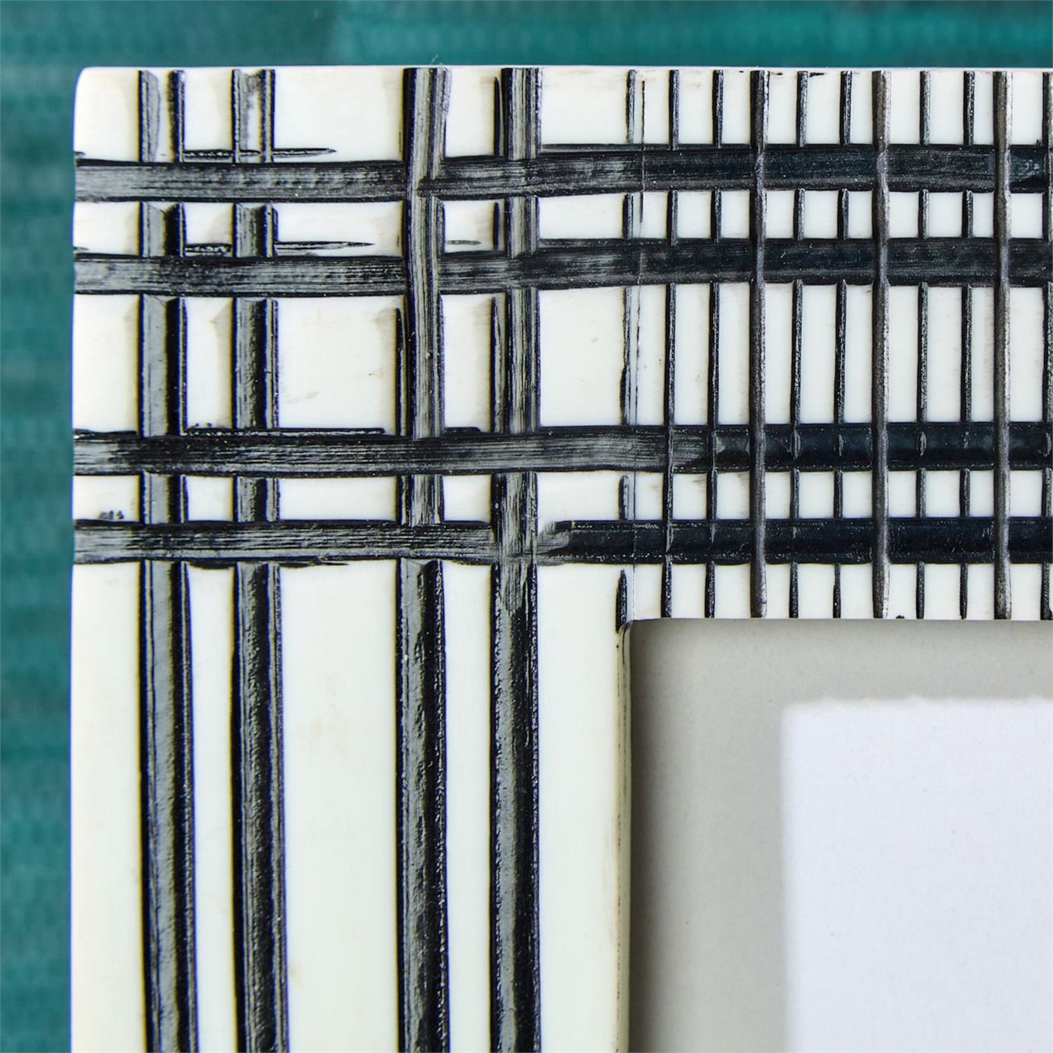 Elevate your cherished memories with this modern plaid set of two black and white photo frames. These frames come in two versatile sizes perfect for displaying 4in x 6in and 5in x 7in photos either horizontally or vertically. The sleek design adds a contemporary touch to any space, making them a perfect addition to your chic home decor.