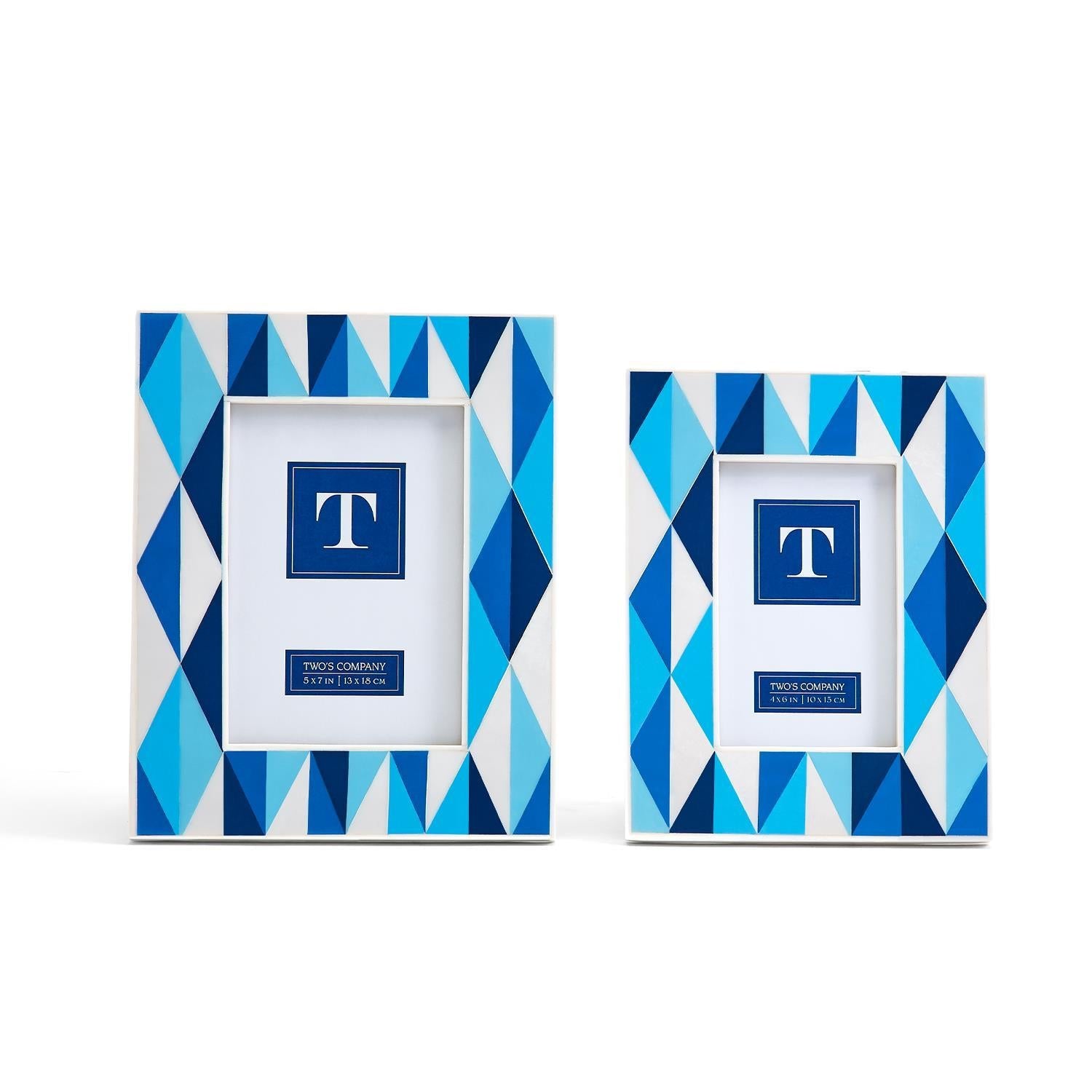 Do your photos need a little extra color? These beautiful bone and resin frames have a variety of playful hues of blues and white. A triangular inlay design that adds extra detail. Will certainly look great in your summer home!