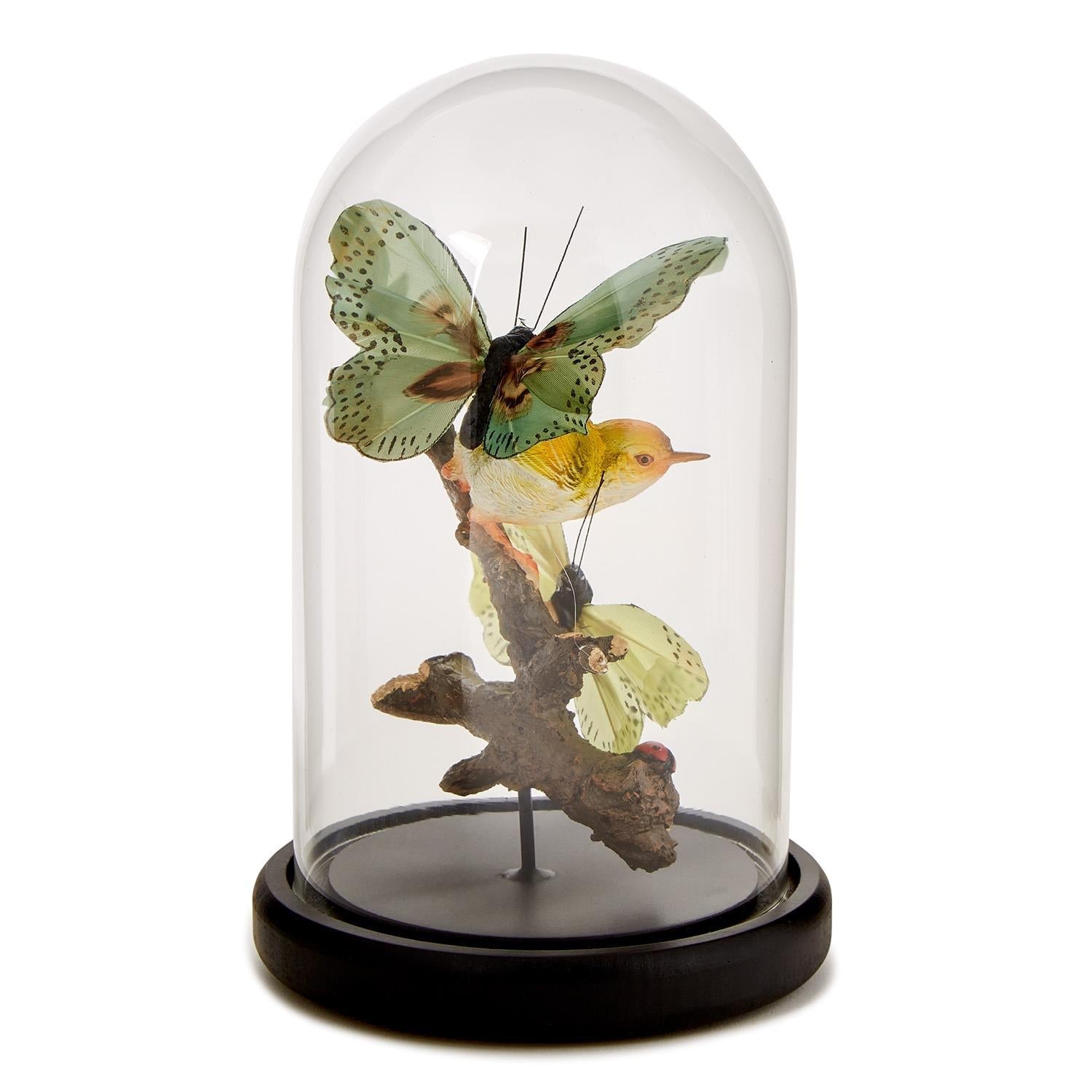 Add a touch of nature-inspired elegance with our 8 1/2in Flora and Fauna Sculpture in a Round Dome sculpture. Handcrafted with a blend of high-quality materials such as MDF, feather, glass, wire, and resin, this piece exudes charm and sophistication. Perfect for adorning a mantelpiece or coffee table, this sculpture will elevate any space with its intricate design. Embrace the beauty of the outdoors with this stunning decorative accessory.