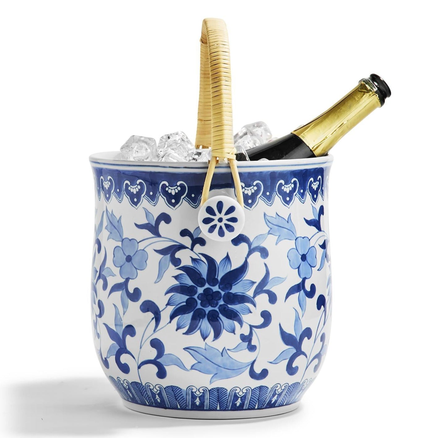 Blue and white will never go out of style! This large Chinoiserie Champagne/Wine bucket will look chic in almost any home. Made from ceramic and accented with a natural bamboo handle that makes it easy to carry.