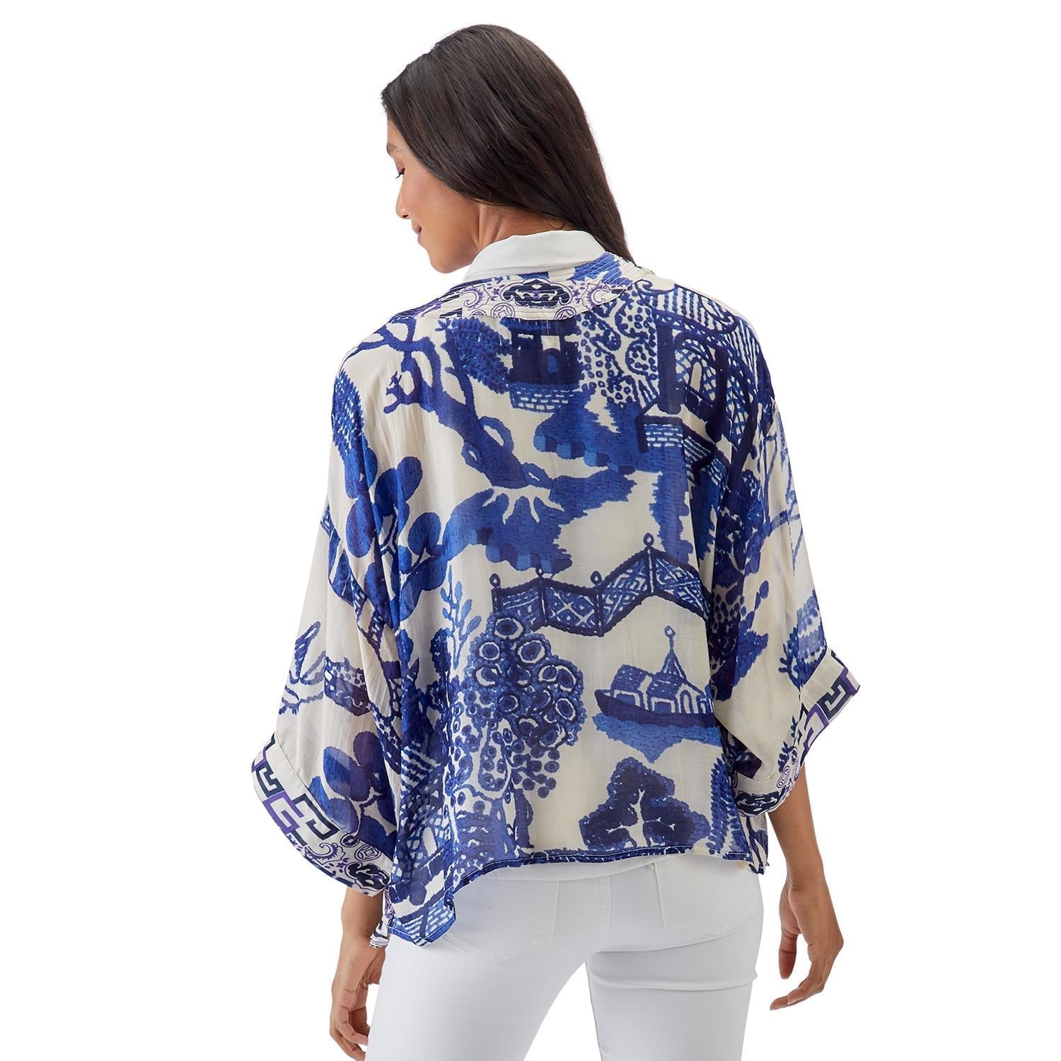 The Giant Willow Pattern Features Navy Pagodas, Birds and Willows Over an Off-White Background Color. With a waist hem length and 3/4th sleeves, this Short Kimono Pairs Well with an All White Ensemble.