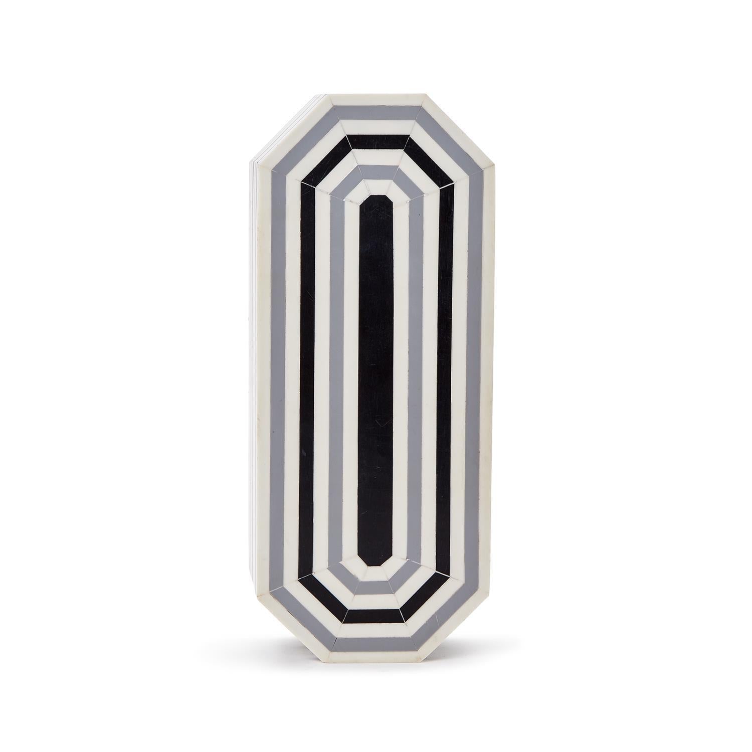This elongated octagonal covered box is designed with a contemporary flair. Created in a grey/black color palette the concentric pattern creates drama and makes a perfect complement to a modern dècor.