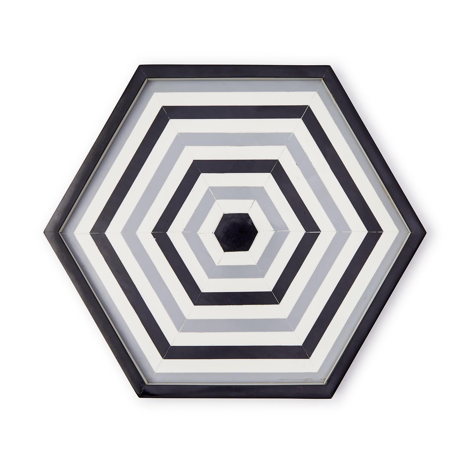 This elongated hexagonal tray is designed with a contemporary flair. Whether for serving or displaying your favorite glasses or decor this tray is sure to affirm your great sense of style. Created in a grey/black color palette the concentric pattern creates drama and makes a perfect complement to a modern dècor.