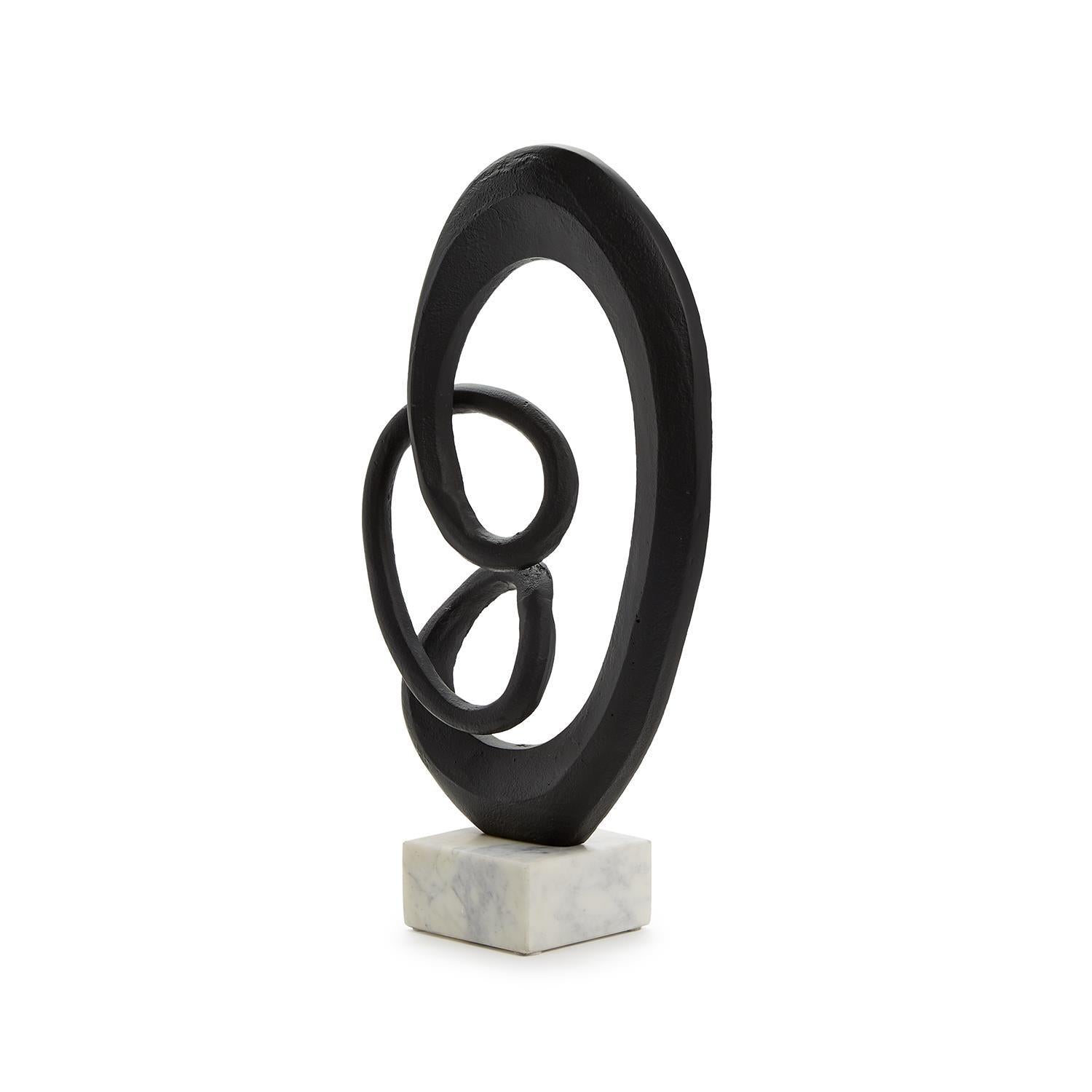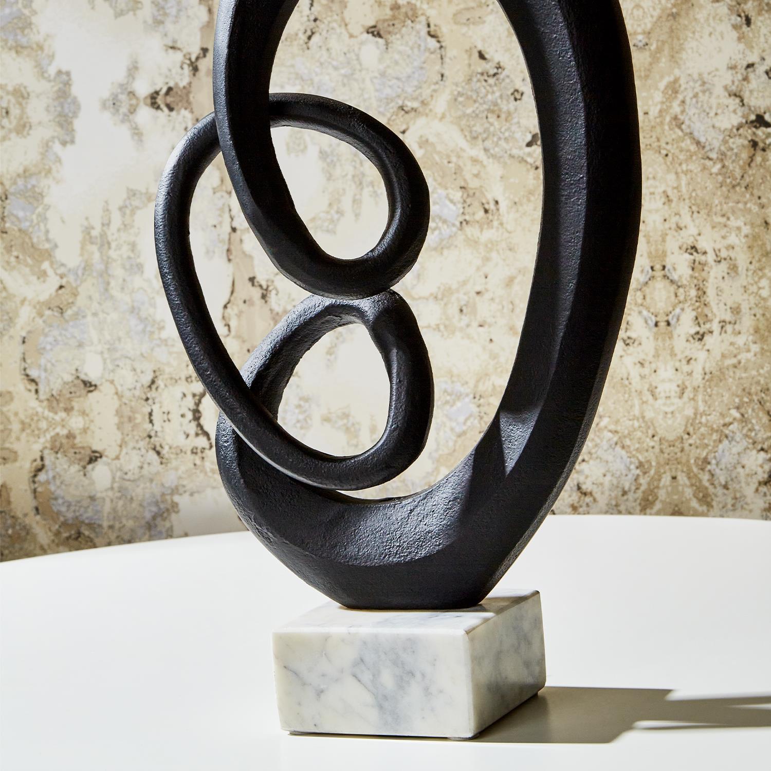 Elevate your space with this stunning infinity sculpture perched elegantly on a sleek marble base. Handcrafted from aluminum, this piece exudes modern sophistication and timeless elegance. The intricate design adds a touch of artistic flair, making it a perfect accent for a stylish living room, sophisticated office, or chic bedroom.