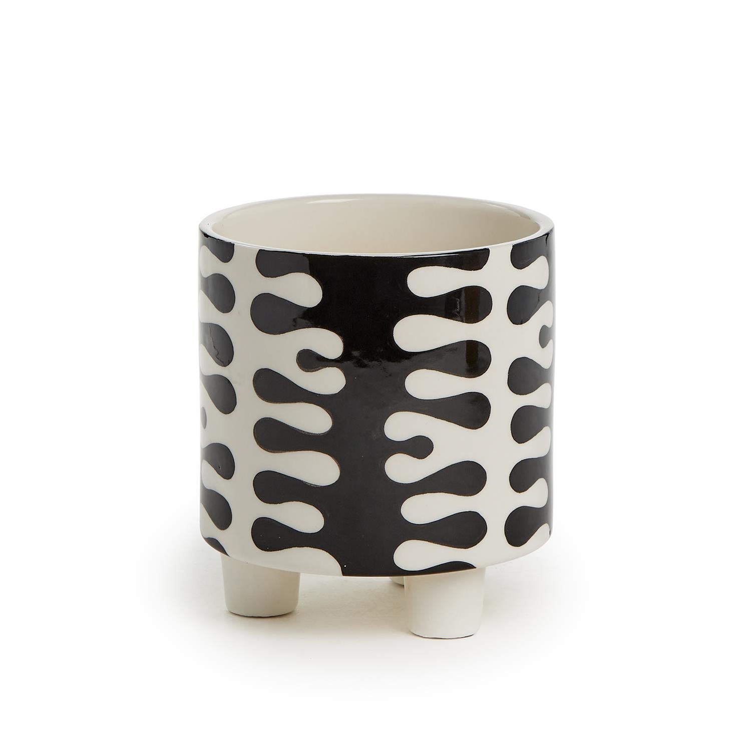 Elevate your greenery with our jigsaw black and white footed planter/cachepot. Handcrafted from ceramic, this piece boasts a striking black and white pattern that adds a touch of sophistication to any space. Standing 6in tall with a 5 1/2in diameter, it's the perfect size for your favorite plant or floral arrangement.