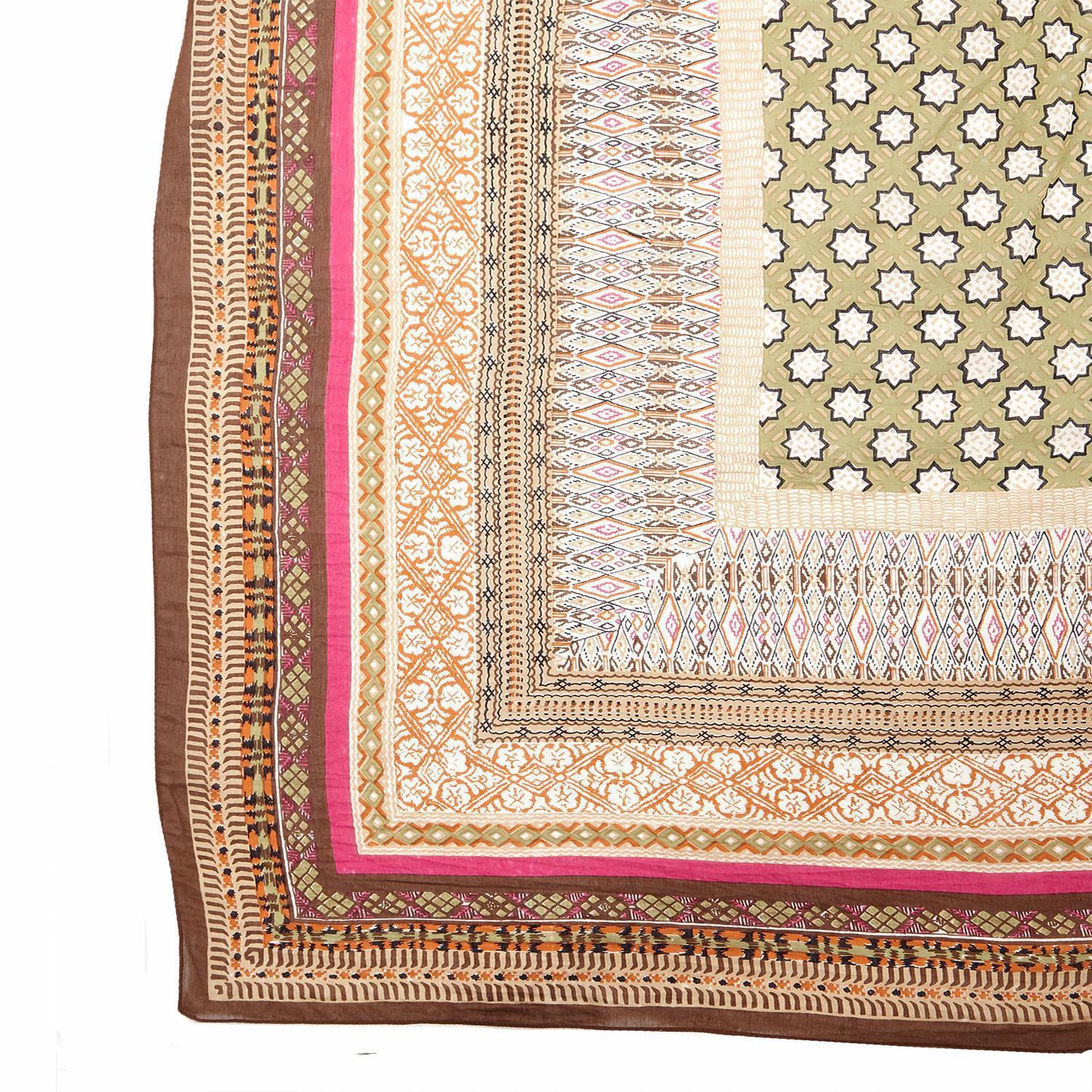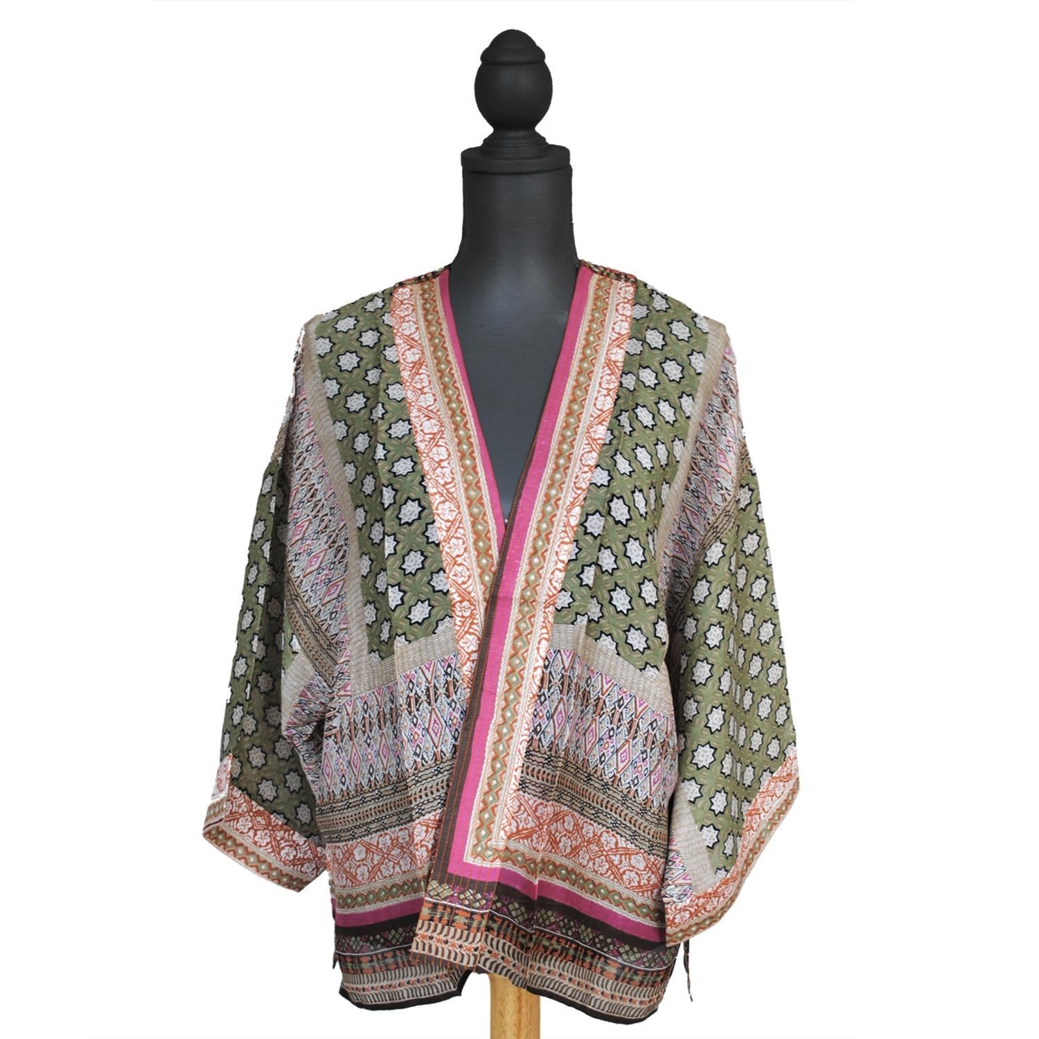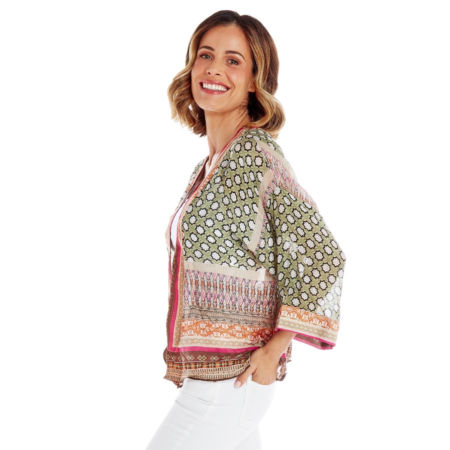 A short kimono is just the thing to shrug on when you could use a grace note up top. Hot pinks contrast strikingly against soft grays and greens in a pattern designed by the amazing women-led textile company One Hundred Stars based in Sheffield, England.