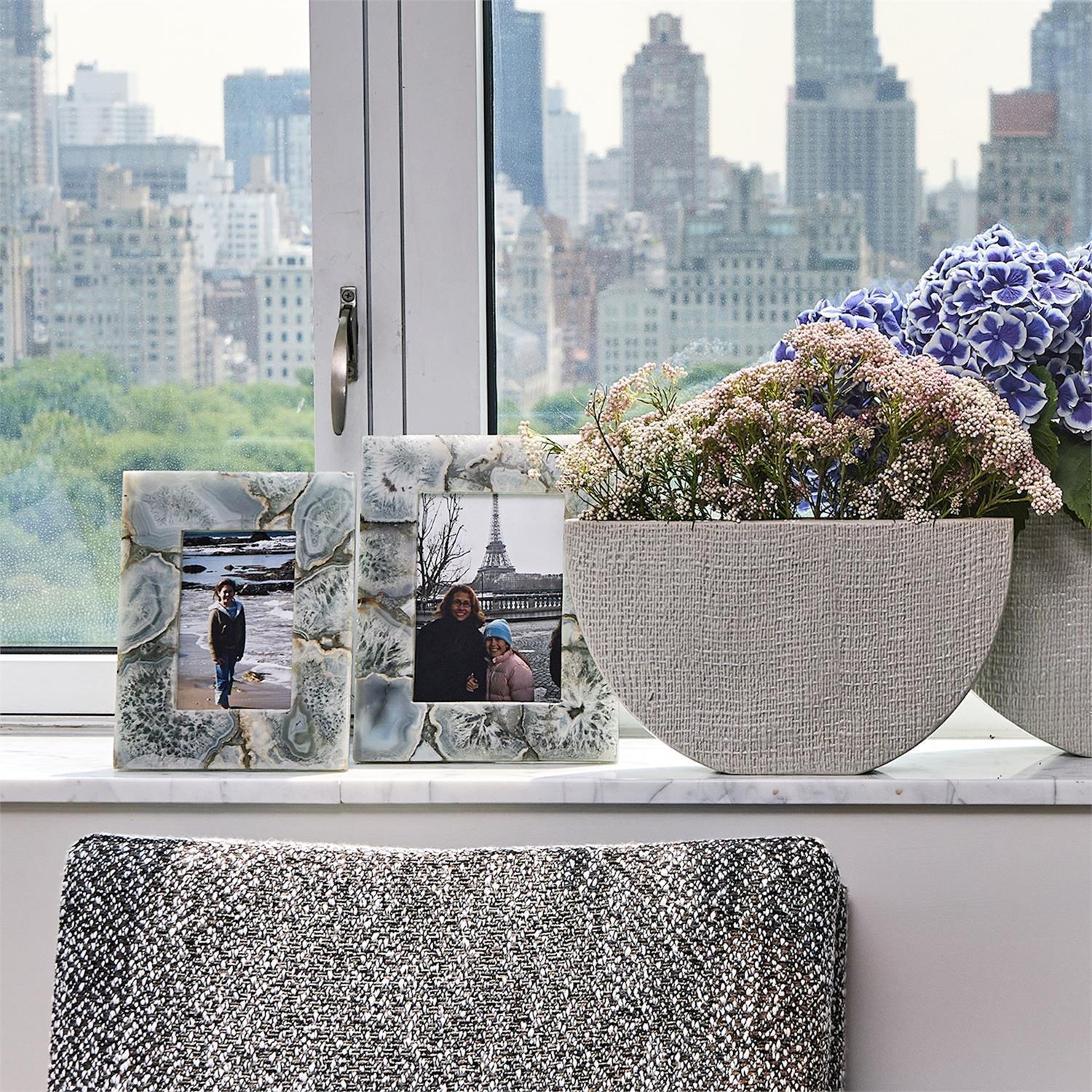 These frames are crafted by fusing natural agate pieces on a glass base. These frames will bring a unique, artisan touch to any photo. As with natural agates, each piece will have variances in color and pattern; no two will be exactly alike