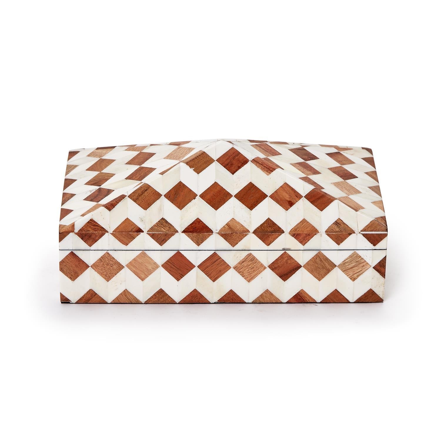 Combining 2 wonderful and interesting materials, this pyramid covered box can fit almost anywhere in one's home. The rich acacia wood grain and soft ivory color of the natural bone complement each other just perfectly.