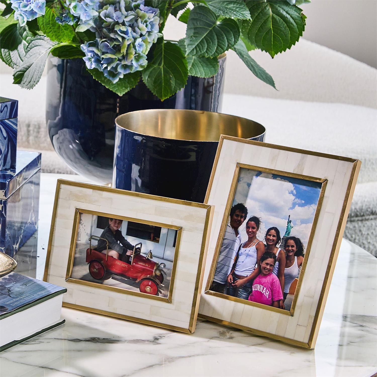 Modern and beautiful come together to create these gorgeous frames. These detailed framed are crafted with patterns made out of small pieces of bones and hand carved bone. Each frame is then accented with metal borders to give a modern take to this ancient handicraft technique.
