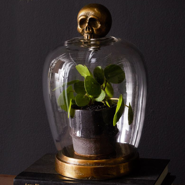 The Skull Cloche is a large curved glass cloche with an antique gold metal skull for a handle. The glass rests on a circular gold metal base meant for displaying collections of creepy treasures.