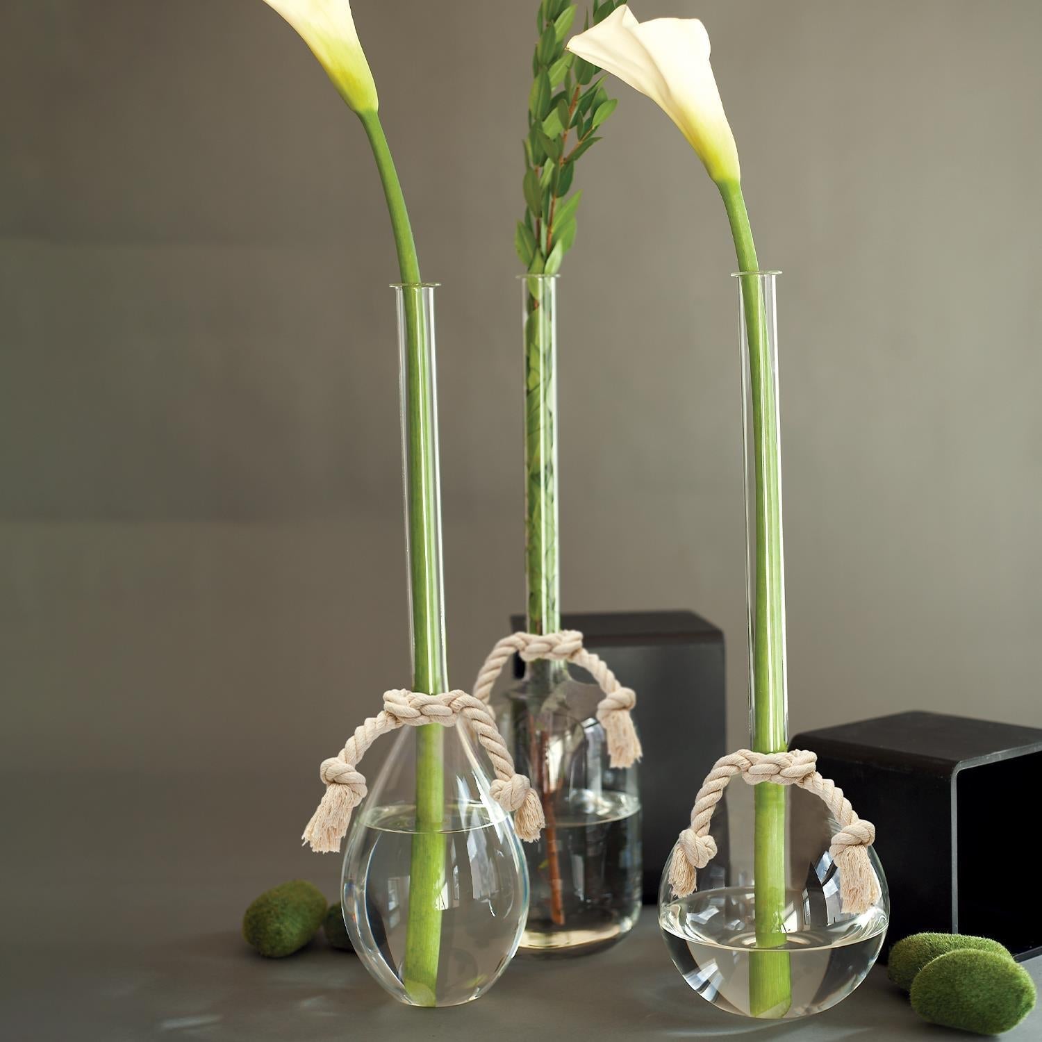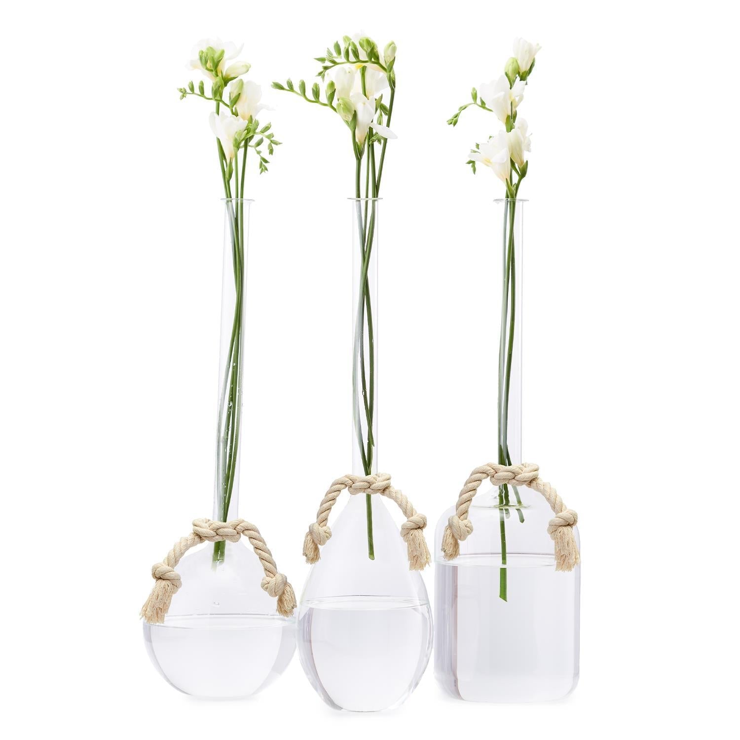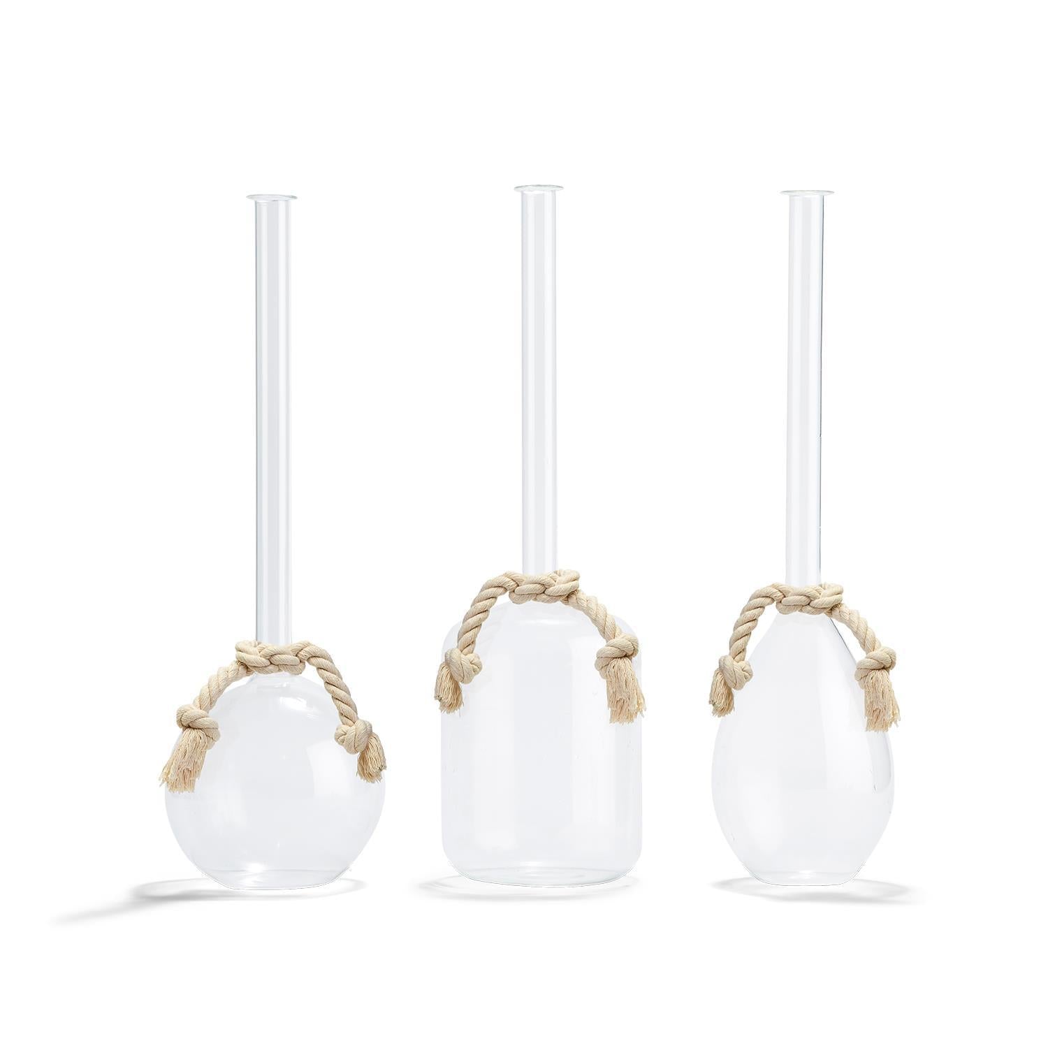 Like little gifts sprouting a flower or greenery, this set of three designs is made from hand-blown glass. Unlike traditional vases, the stunning designs feature a unique green ribbon/ natural rope detail that can be updated to fit any look or dècor.