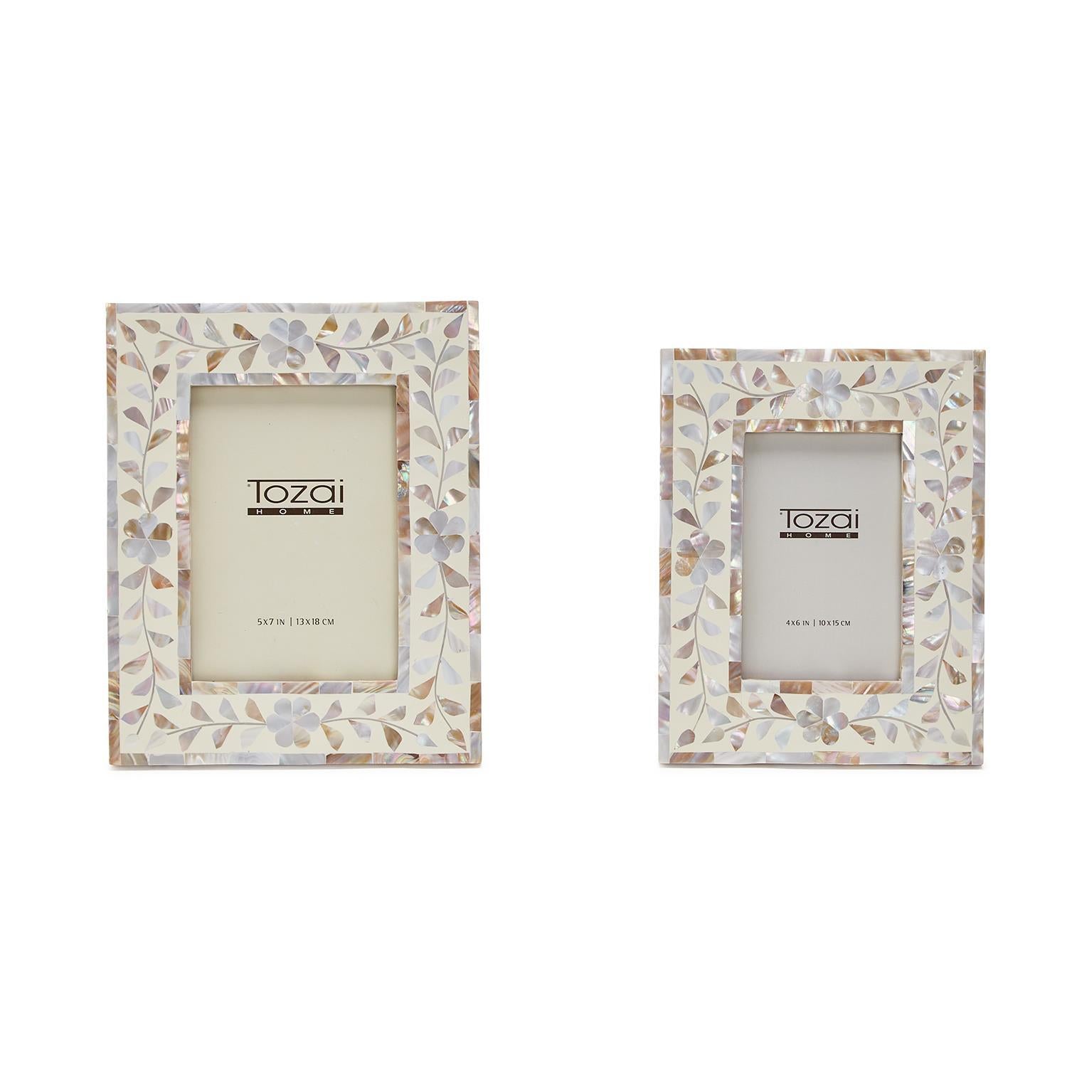 Enrich your home's aesthetic with an extraordinary Set of 2 inlaid photo frame with Mother of Pearl (MOP) and Resin, delicately showcasing the graceful essence of natural flower petals. This captivating set exudes an unparalleled sophistication, captivating the eye with its shimmering effects and imbuing the surrounding space with a light, airy ambiance. Meticulously handcrafted using genuine mother of pearl shell and opulent mango wood, this set of frames possess the remarkable ability to elevate your coffee table, desk, dresser or bookshelf into a realm of visual splendor. Embrace the enchantment of natural materials and their inherent allure by gracing your living space with this meticulously crafted masterpiece. Stack multiple boxes together for an added layer of beauty.